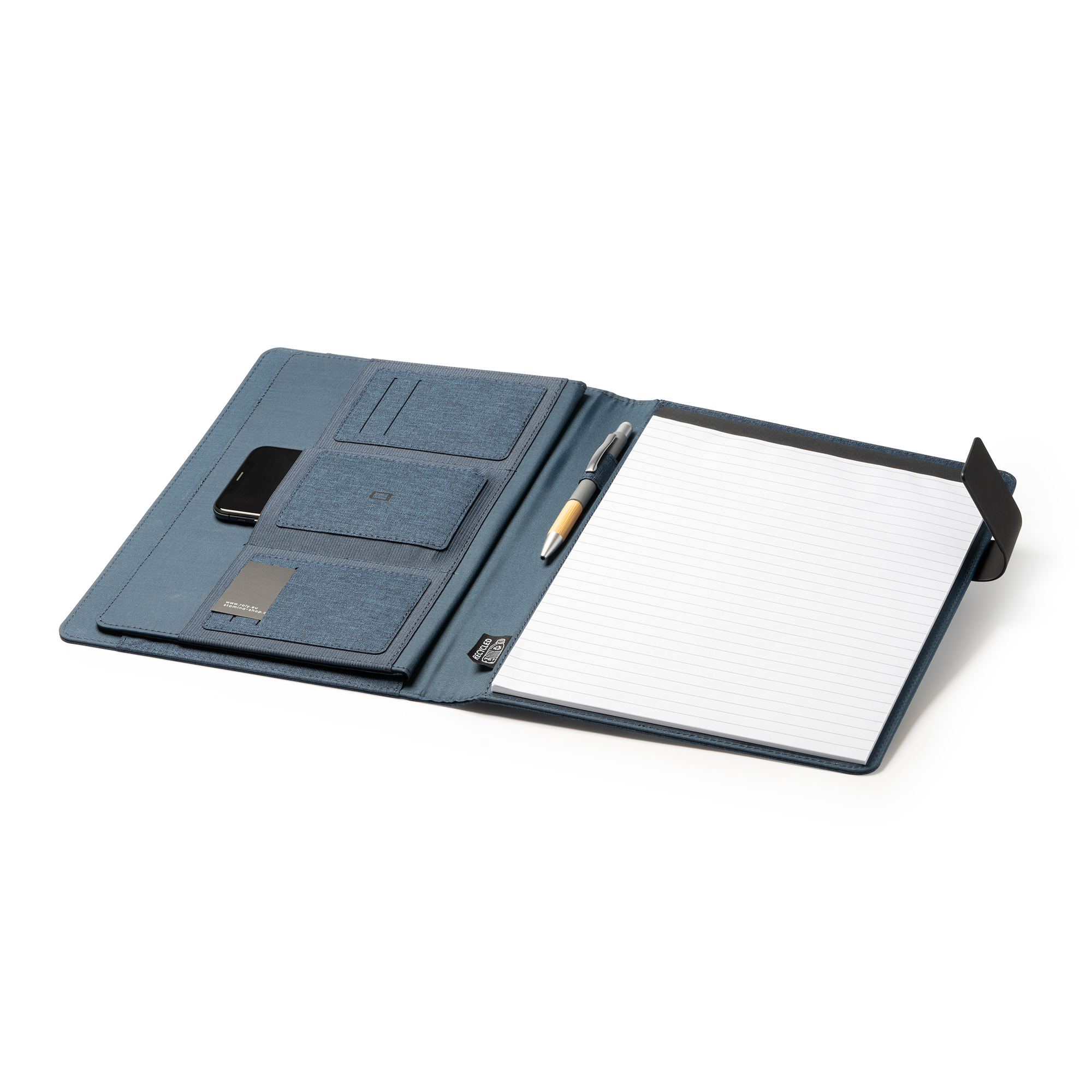 Универсальная папка А4 из вереска 600D RPET с магнитной застежкой. В комплект входит съемный блокнот на 30 листов с подкладкой. 4 внутренних кармана и держатель для ручек.
