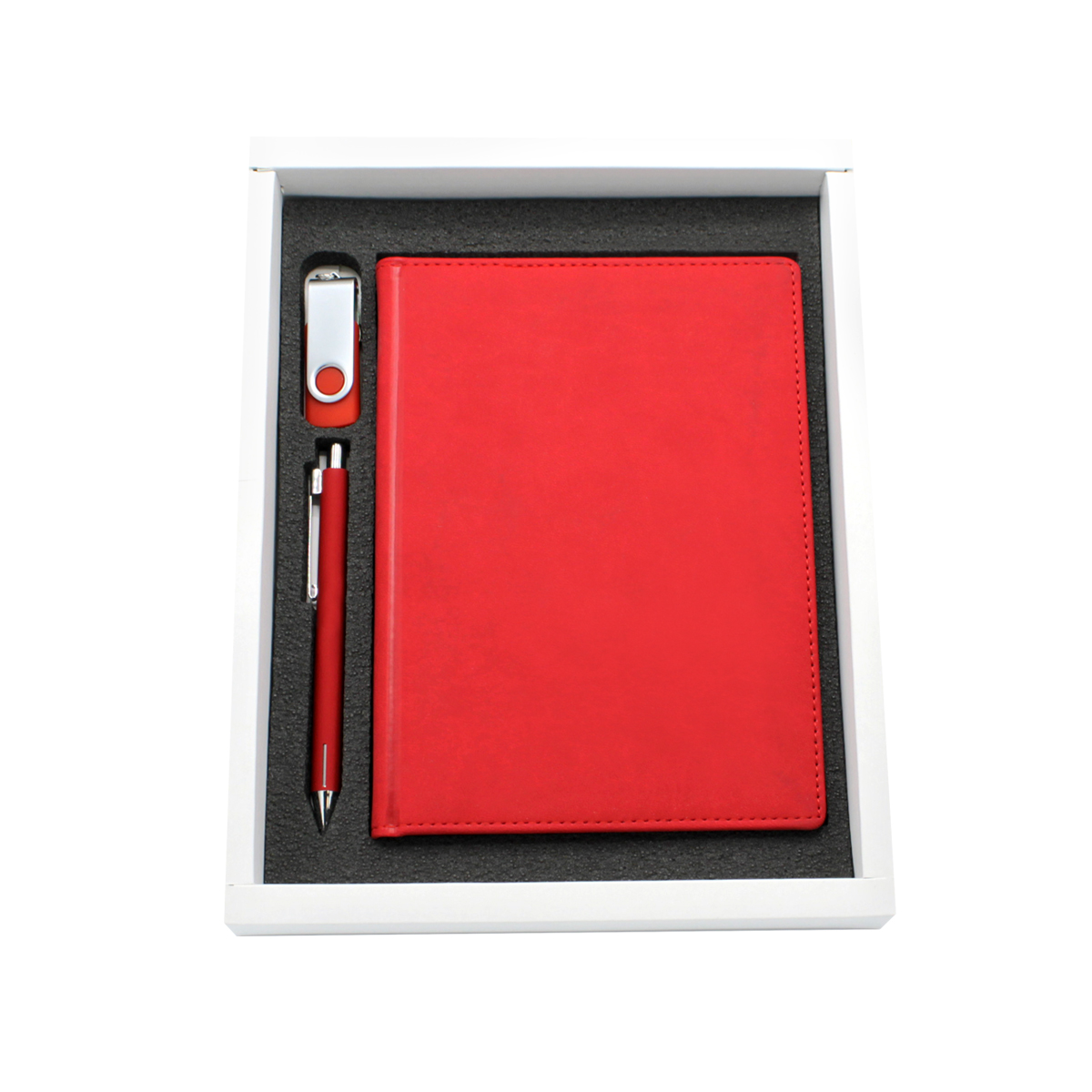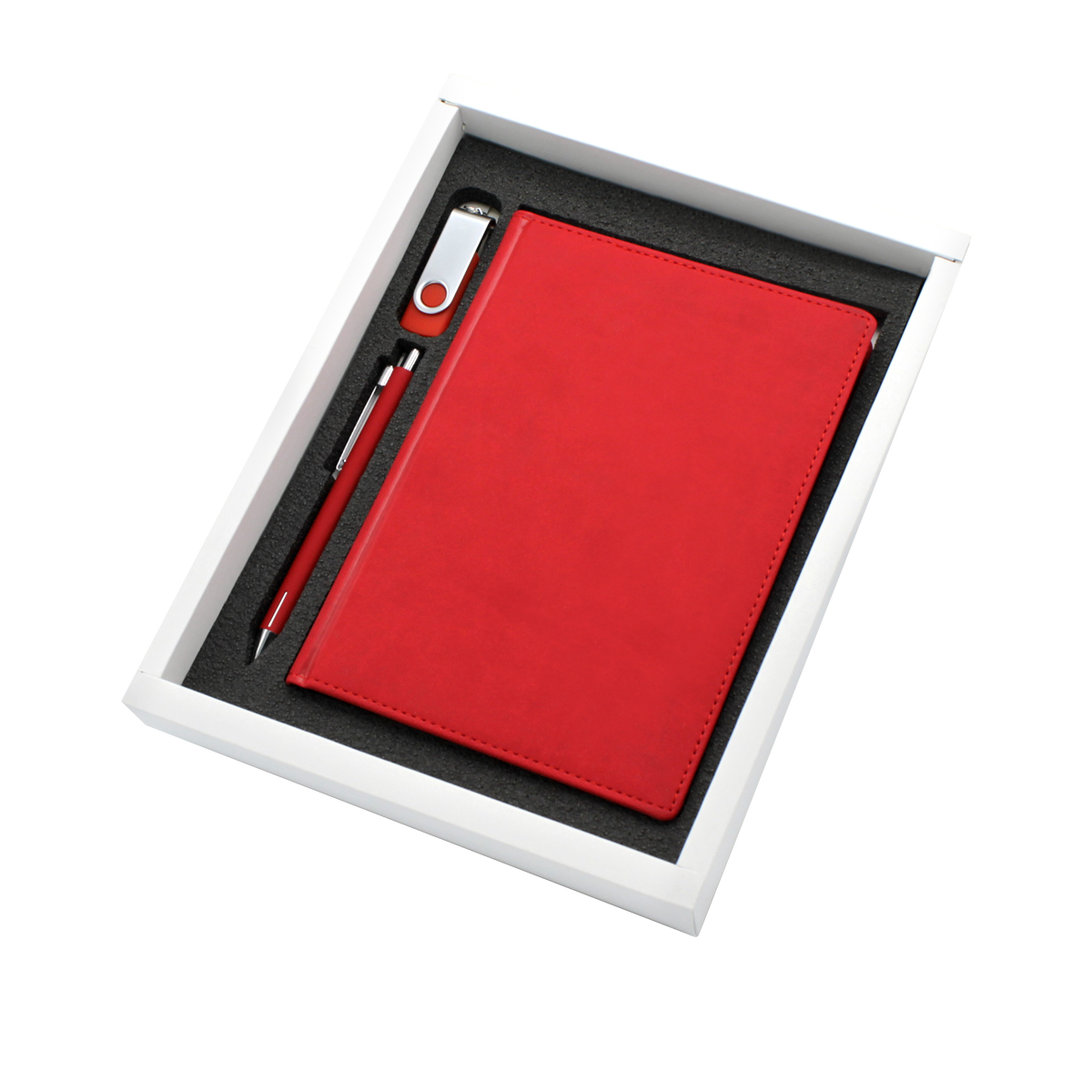 В состав подарочного набора входят: Флешка "Twist" 16 Гб, Ручка шариковая металлическая Elegant Soft, ежедневник Velvet A5 недатированный, подарочная коробка