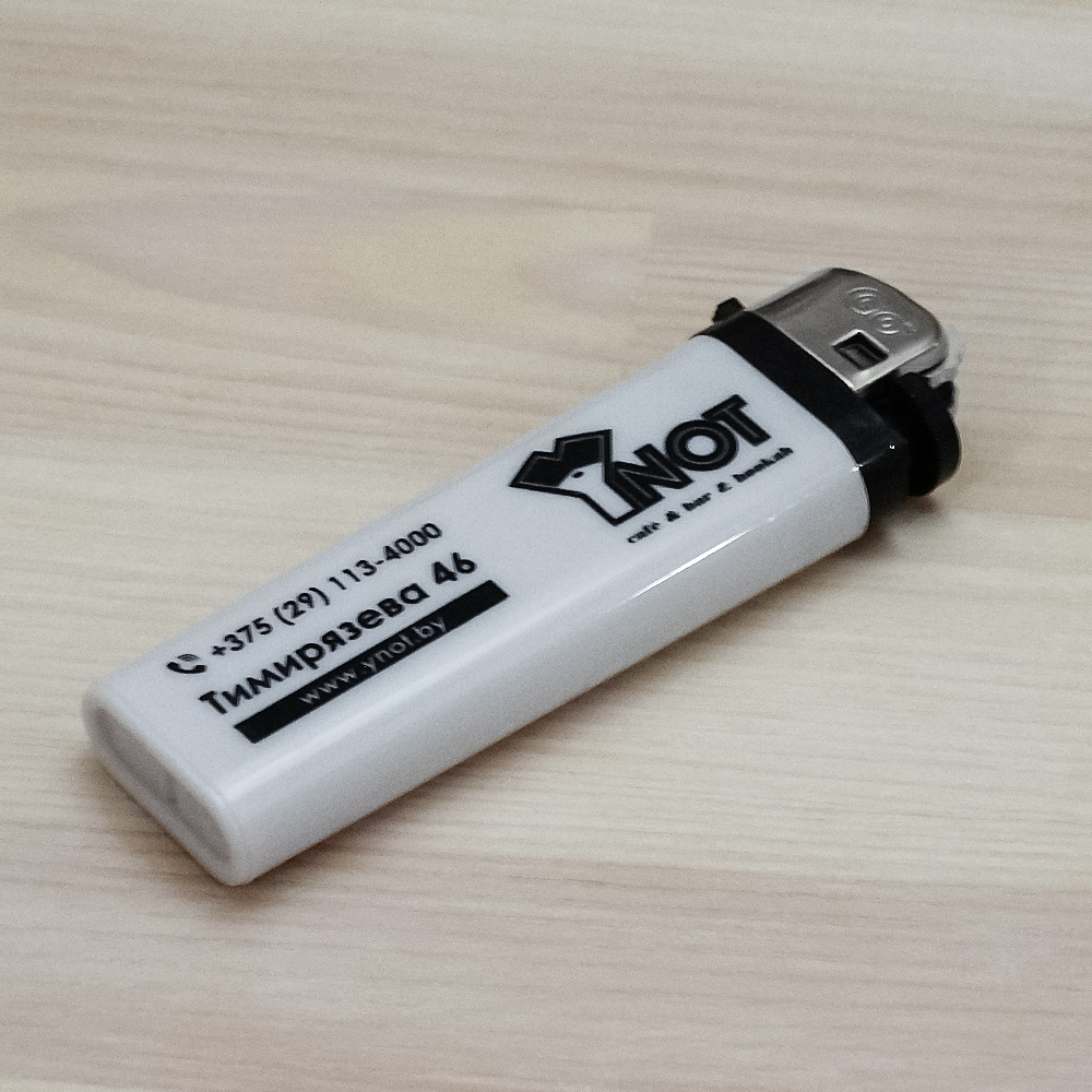 Зажигалка с логотипом кафе Ynot. Брендированные кремниевые зажигалки для посетителей.